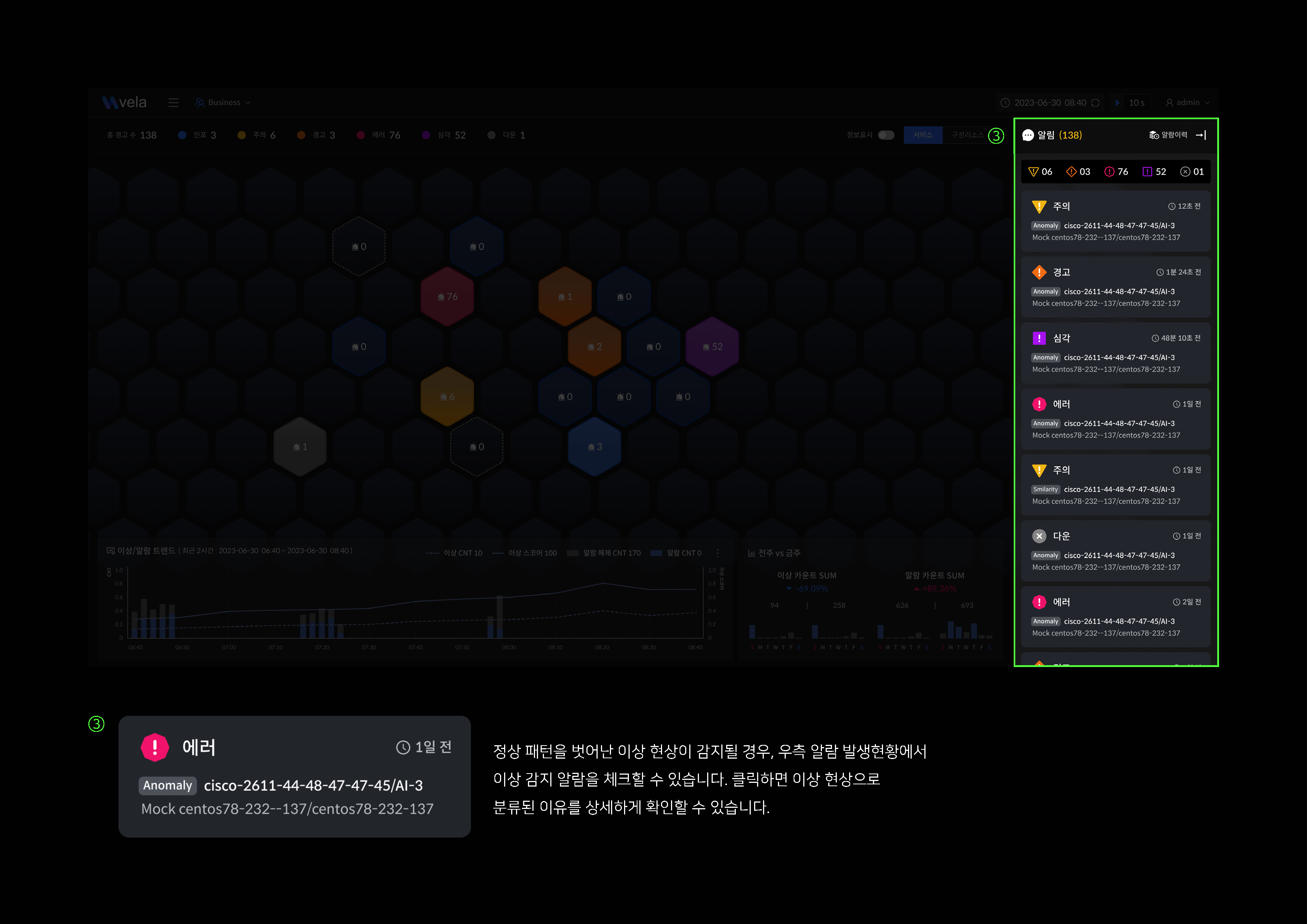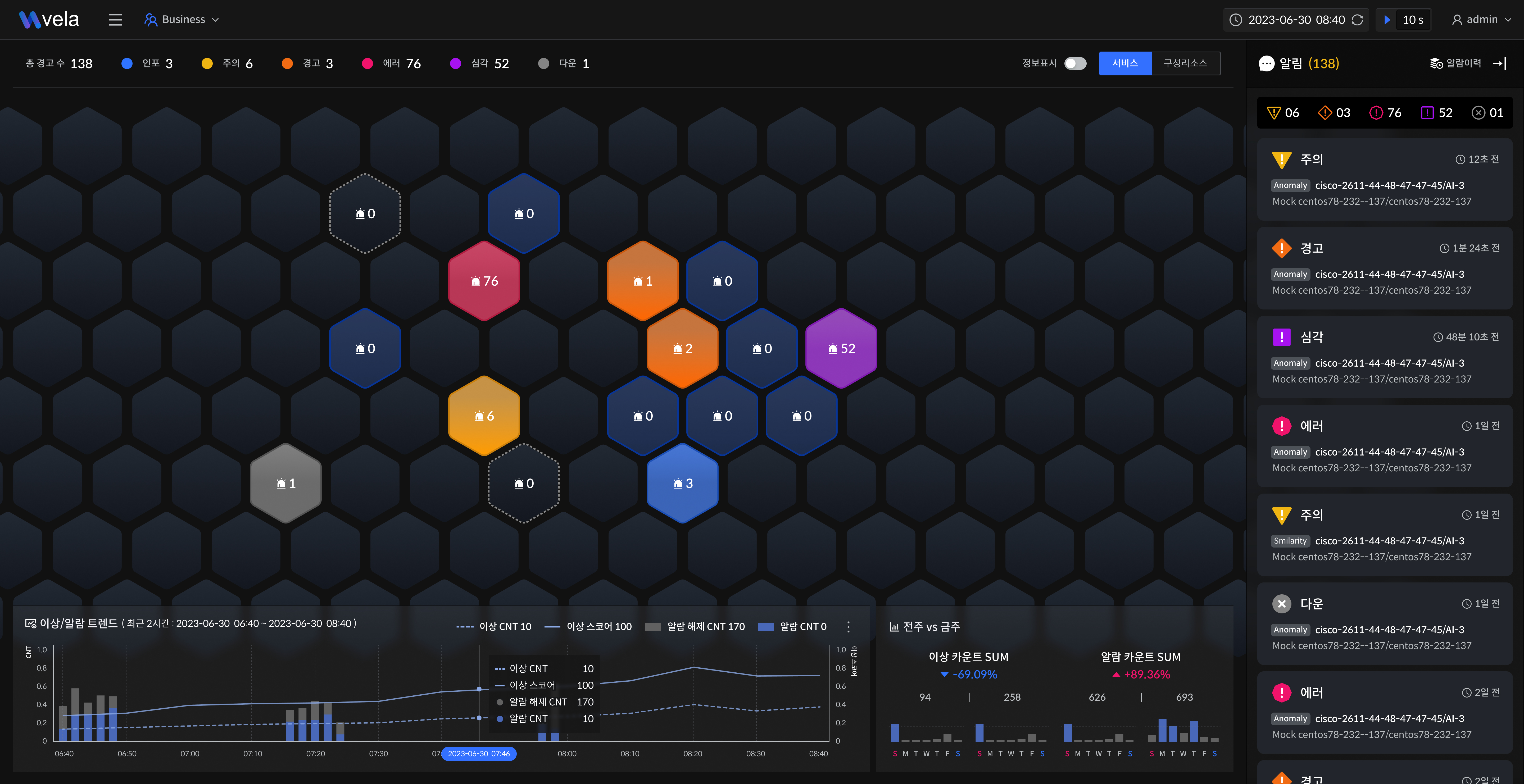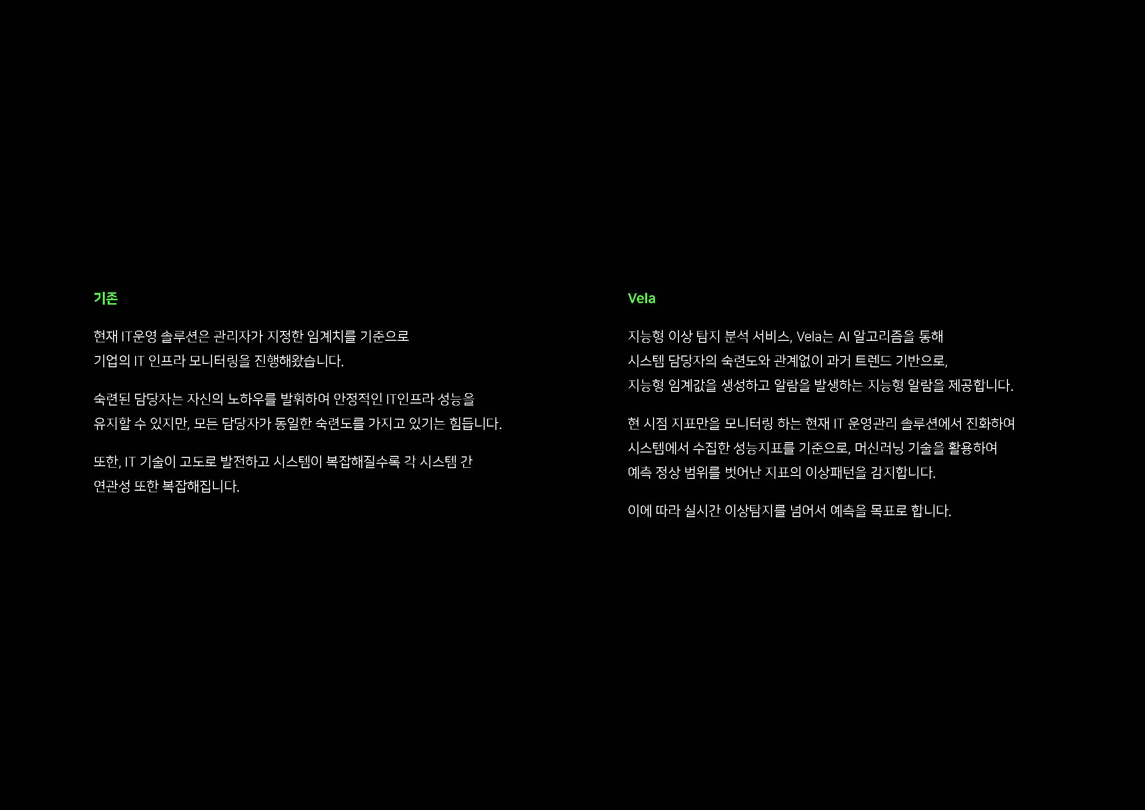 지능형 이상 탐지 분석 서비스, Vela는 신속한 장애 탐지와 판단으로 선제적 장애 분석 대응 체계를 지원하는 솔루션입니다.