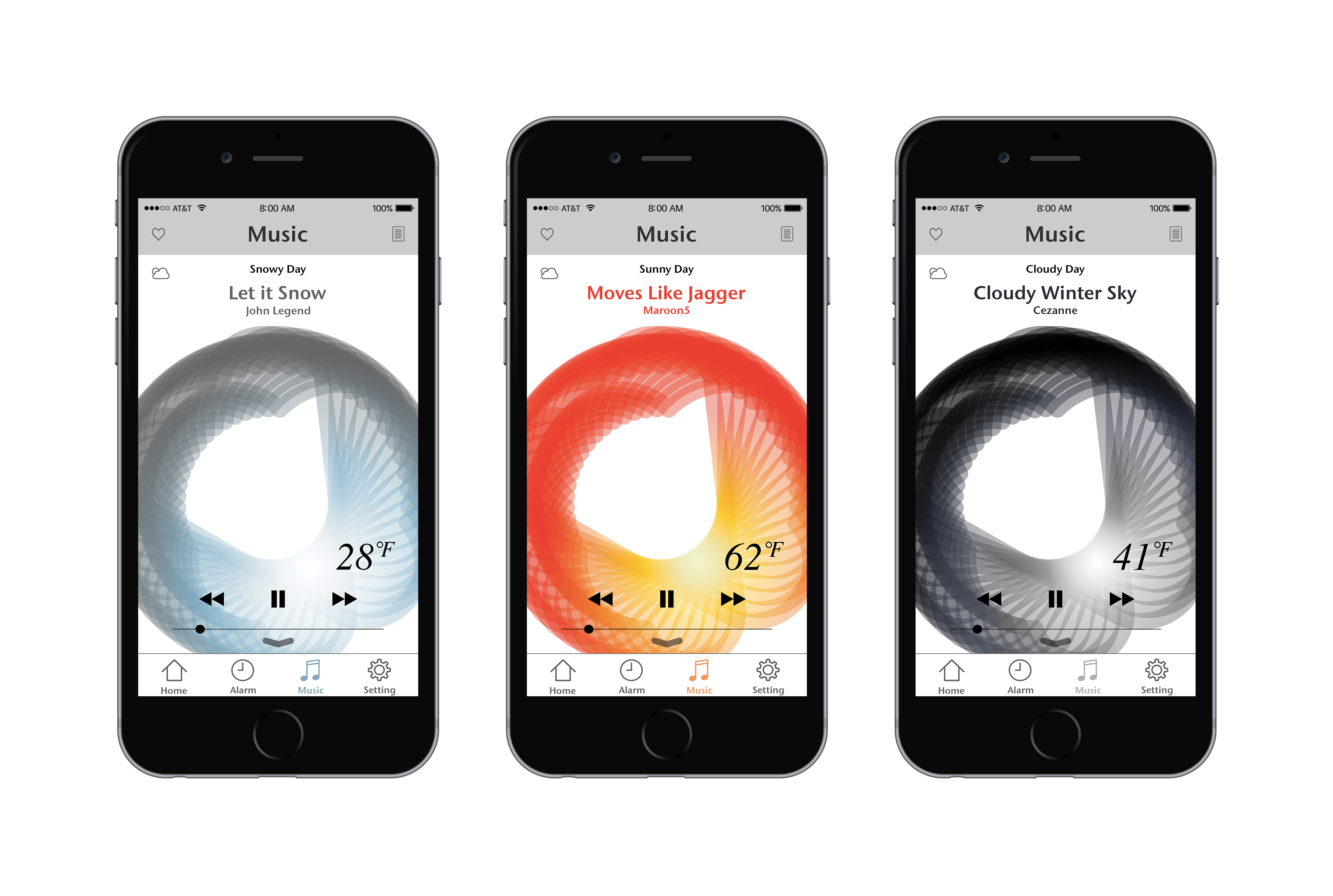 Solution & Concept Use the music! Weather and music are commonly related to people’s emotion and condition. Listening to the music which is fit well for the weather will help you to get a powerful energy. ‘Weather Music’ will give you a wake-up call with various music which greatly matches the weather. The music will be changed every morning! You can check the information of song and also get lots of music recommendation lists.